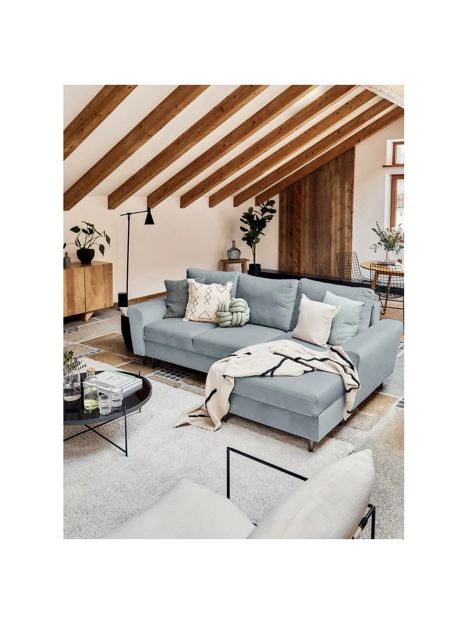 Canapé d’angle en velours (4 places) avec fonction de couchage et espace de rangement