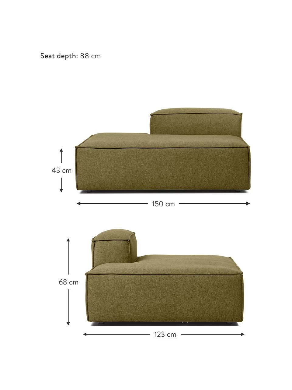 Dimensions de l’assise : larg. 88 cm, haut. 43 cm, prof. 88 cm
