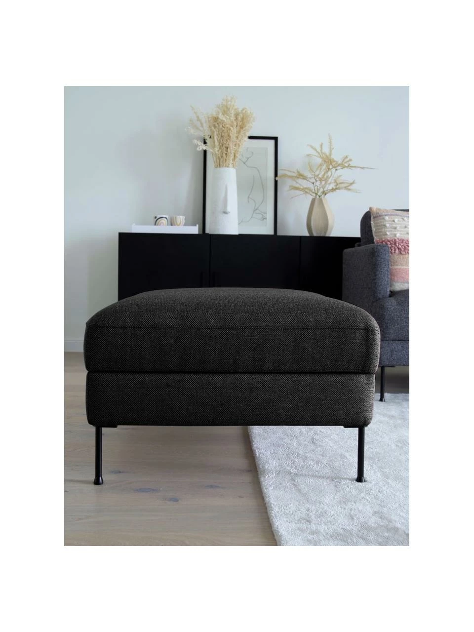 Le pouf offre un grand espace de rangement : sous le couvercle, les couvertures et les coussins disparaissent en un clin d’œil